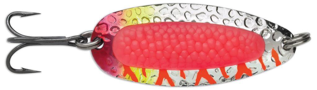 The Pixee Spoon features heavy construction that permits incredibly long casts and deep retrieves even in fast moving water. Egg sac insert adds natural element that drives fish wild. Plated brass with a hammered finish reflects more light increasing flash. Finished with premium VMC black nickel hook. Each spoon includes a matched siwash hook. Considered "Precious Metal" in Alaska.
