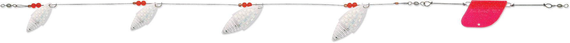 Offering a unique blade design that is half smooth and half rippled, the School-O-Minnows troll offers a pulse and vibration unmatched by trolls featuring similarly sized blades. Easy-pulling design features high strength flexible cable rigging...