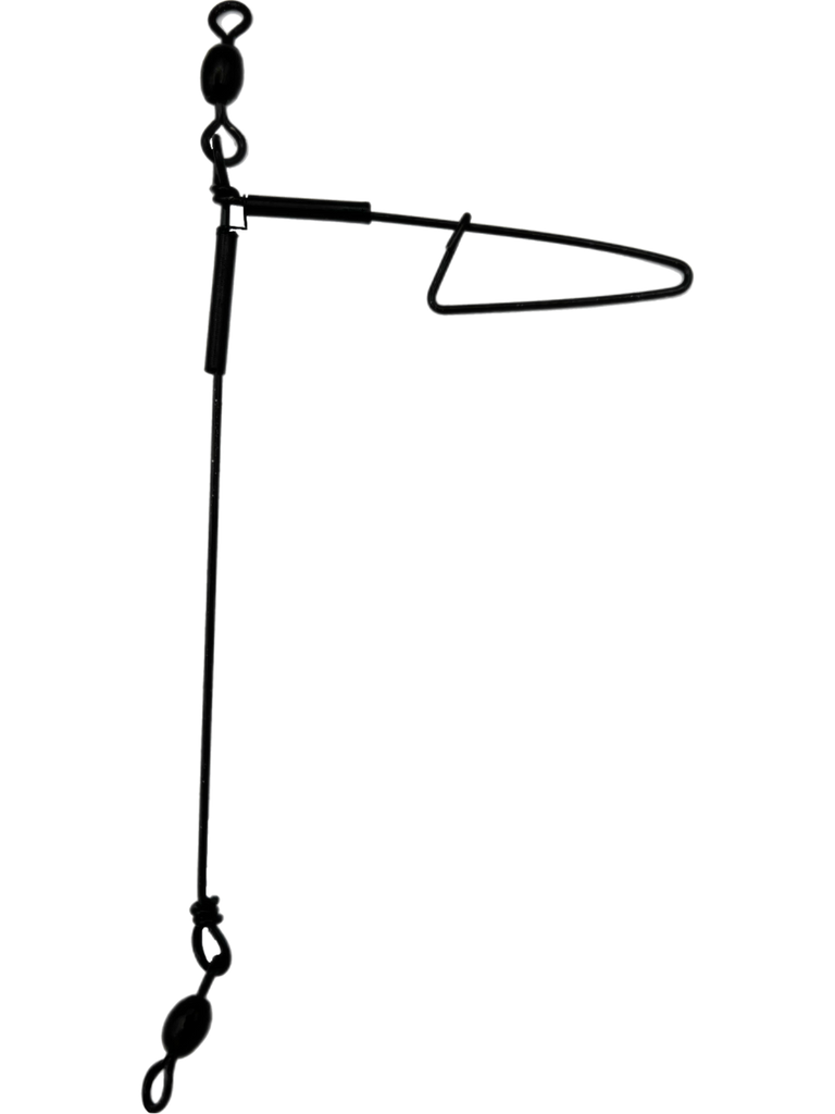 Beau Mac Wire spreader made from heavy duty stainless welding Rod coated in Glow tubing. This spreader has a swivel for attaching line and corkscrew swivels for attaching lead and leader.