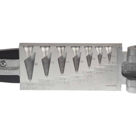 DO-IT mold model JD-7-A features seven cavities in sizes 1/32, 1/16, 1/8, 1/4, 3/8, 1/2, 3/4. See table for hook size requirements.