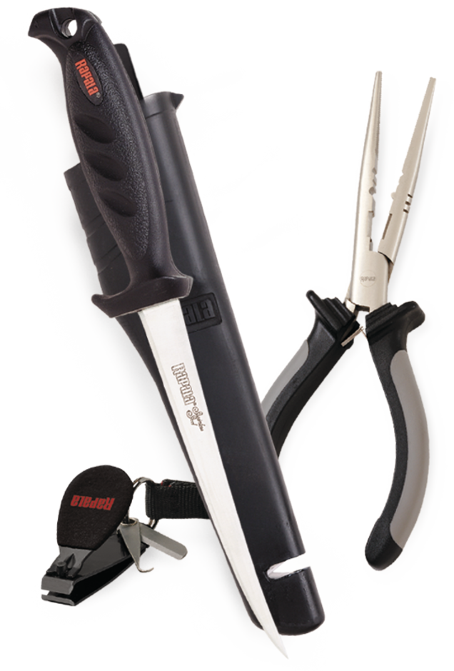 Essential Combo Pack includes Fisherman's Pliers, Falcon Fillet Knife with Sheath and Rapala Fishing Clipper.Fisherman's Pliers have carbon steel construction with nickel plated finish. The Falcon Fillet Knife with a stainless steel blade has a...